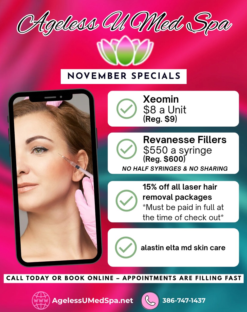 I have been coming to Ageless U Med Spa for over a year and I LOVE Annabelle (Sunshine), Leslie and Lisa! They are knowledgeable about their products and which one is best for you and they make you feel so comfortable and make the environment fun! I walk out feeling beautiful because of these 3 amazing, beautiful ladies! Thank you for everything you do!!!